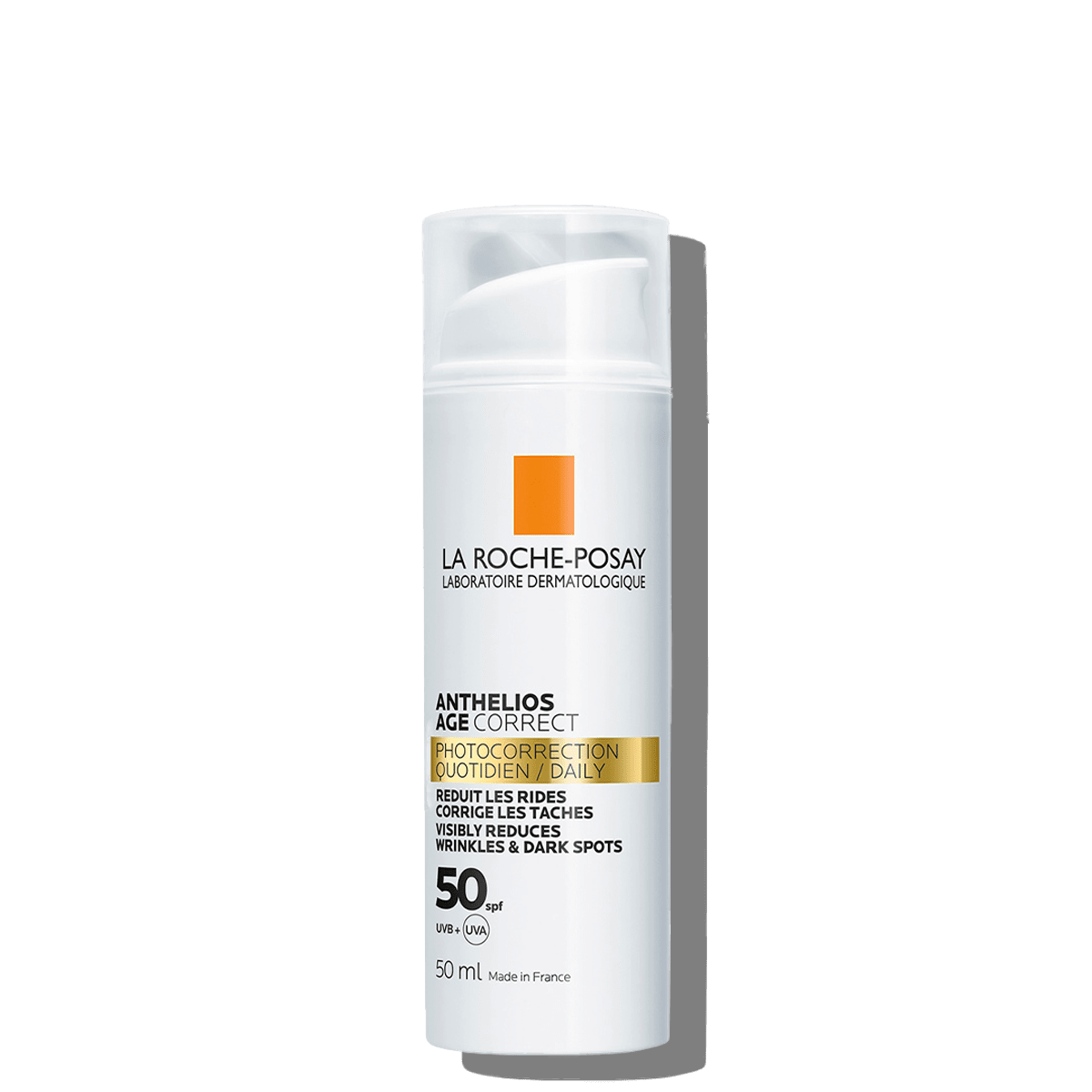 Anthelios Protector Solar Age Correct SPF 50+ es un fotoprotector facial de muy alta protección solar formulado con ácido hialurónico fragmentado, niacinamida y PHE-resorcinol que contribuyen a proteger frente a los rayos UVB y UVA y a prevenir y corregir los signos del envejecimiento inducido por la radiación solar, incluyendo arrugas finas, manchas oscuras y pérdida de elasticidad.