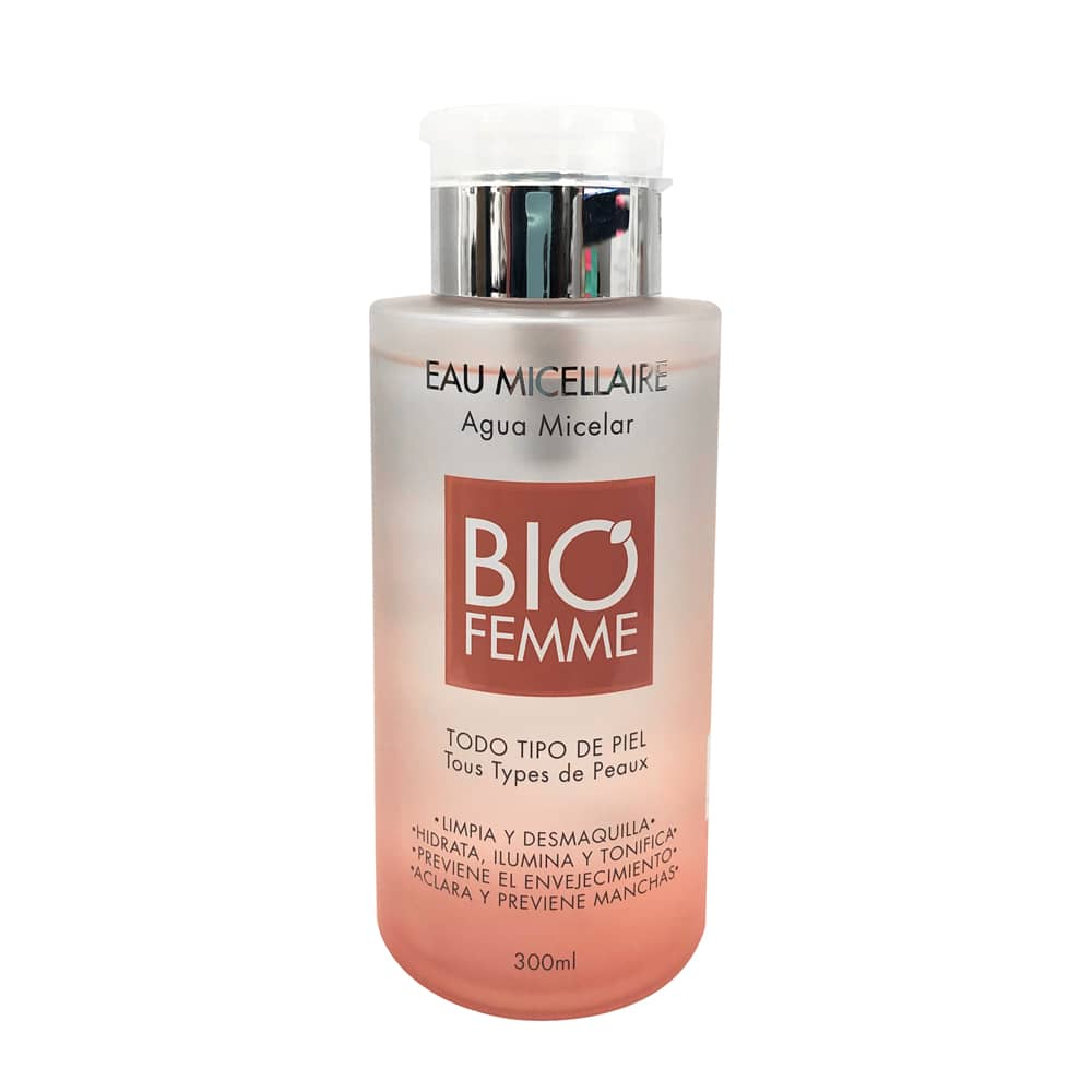 BIO FEMME BF Agua Micelar 300 ml es un limpiador facial diseñado para eliminar impurezas, exceso de sebo y maquillaje sin agredir la barrera cutánea. Su fórmula micelar actúa como un imán que captura y arrastra las partículas de suciedad y los residuos cosméticos, proporcionando una limpieza profunda y respetuosa incluso en pieles sensibles.