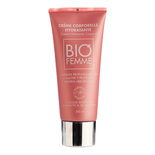 BIO FEMME Crème Corporelle 200 g es una crema corporal hidratante formulada con agentes emolientes y humectantes que ayudan a restaurar la suavidad natural de la piel. Está indicada para pieles secas, normales o con tendencia a la deshidratación.