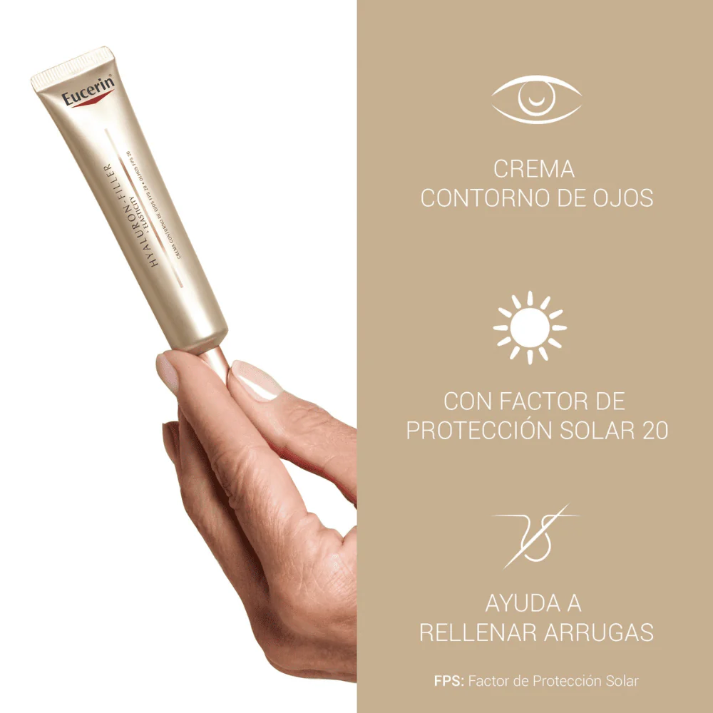 Eucerin Hyaluron-Filler + Elasticity Contorno de Ojos FPS20 15 ml es una crema antiedad indicada para pieles maduras o con signos visibles de envejecimiento. Su fórmula combina ácido hialurónico de peso molecular alto y bajo, con un activo llamado arctiína que estimula la renovación del colágeno, lo que permite rellenar arrugas profundas, mejorar la elasticidad y firmeza de la piel, y restaurar la densidad dérmica. Además, incorpora protección solar FPS 20 con filtro UVA/UVB, lo cual ayuda a prevenir el foto-envejecimiento y reduce el riesgo de que los rayos solares profundicen las arrugas o aceleren el envejecimiento en la zona del contorno de ojos.