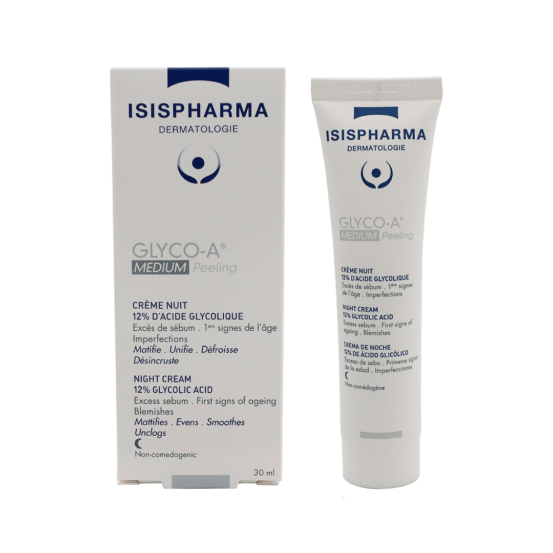Glyco-A Medium Peeling 12 % es una crema de noche exfoliante con ácido glicólico formulada para ofrecer los beneficios de un peeling químico suave en casa. Contiene ácido glicólico al 12 %, uno de los alfa-hidroxiácidos más eficaces para eliminar las células muertas, suavizar el relieve cutáneo y promover la renovación celular. Estos efectos ayudan a revelar una piel más lisa, luminosa y uniforme, mejorar la textura e incluso minimizar la apariencia de arrugas finas y poros dilatados.