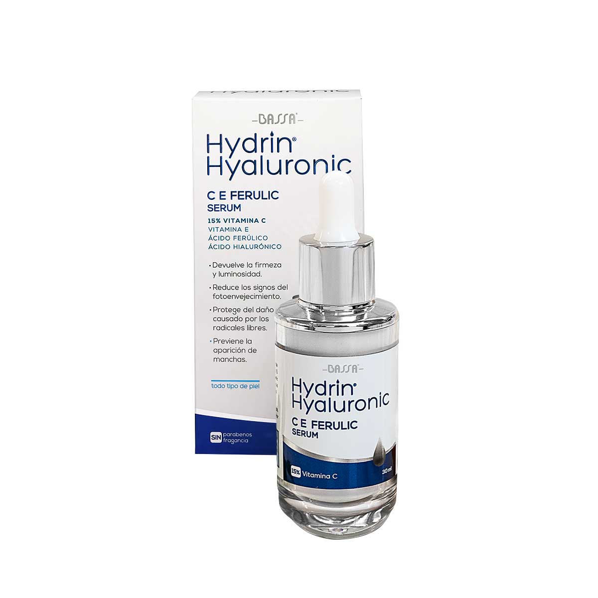 Hydrin Hyaluronic C-E Ferulic Serum 30 ml es un suero facial antioxidante y antiedad formulado para proteger la piel frente a los daños ambientales, mejorar la luminosidad y reducir los signos visibles del envejecimiento. Su fórmula combina vitamina C pura (15 %), vitamina E, ácido ferúlico y ácido hialurónico, una mezcla potente que actúa para neutralizar radicales libres, estimular la producción de colágeno y mejorar la hidratación de la piel. Gracias a esta combinación de antioxidantes y activos hidratantes, el serum ayuda a suavizar líneas de expresión y arrugas, mejorar la firmeza y aportar un efecto iluminador al rostro. Además, brinda protección frente a agresores ambientales como la radiación UV, infrarroja y la contaminación, factores que contribuyen al envejecimiento prematuro de la piel.