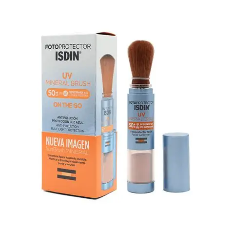 ISDIN Fotoprotector UV Mineral Brush SPF50+ 2 g es un fotoprotector solar facial en formato polvo con brocha integrada, diseñado para ofrecer muy alta protección solar SPF 50+ con filtros 100 % minerales que actúan como una barrera física frente a los rayos UVA y UVB. Su presentación en polvo invisible lo hace ideal para reaplicar la fotoprotección sobre maquillaje o en cualquier momento del día, sin dejar residuos blancos y con un acabado mate y natural.