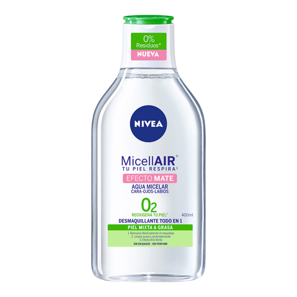 NIVEA Agua Micelar Mate 400 ml es un agua micelar formulada con micelas y un complejo de aminoácidos y algas marinas para limpiar, desmaquillar y purificar la piel de manera eficaz sin necesidad de frotar ni enjuagar. Está diseñada para atraer y eliminar impurezas, exceso de sebo y residuos de maquillaje, mientras ayuda a controlar el brillo y proporciona un acabado mate y equilibrado.