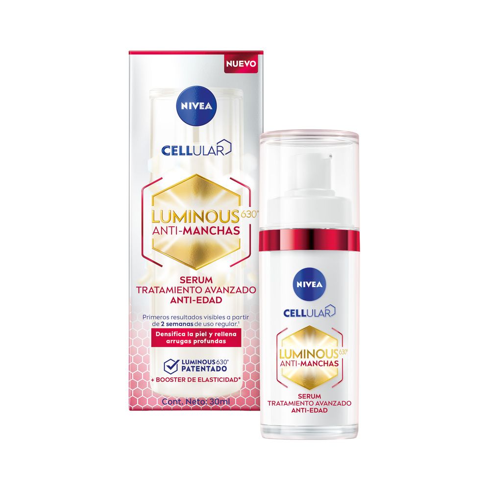 Este suero facial es un tratamiento avanzado antimanchas y anti-imperfecciones desarrollado por NIVEA con la innovadora tecnología Luminous630®, resultado de más de 10 años de investigación para abordar la hiperpigmentación y manchas oscuras a nivel celular. Su fórmula ligera y de rápida absorción combina Luminous630® patentado con ácido hialurónico y otros activos que ayudan a reducir manchas existentes, equilibrar la producción de melanina para prevenir la aparición de nuevas manchas, uniformar el tono cutáneo y mejorar la textura y luminosidad de la piel.