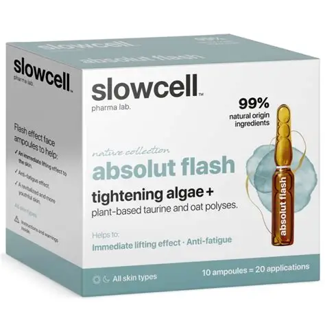 SLOWCELL ABSOLUT FLASH 1 caja x 10 ampollas es un tratamiento cosmético en formato de ampollas de alta concentración diseñado para proporcionar un efecto lifting inmediato y un aspecto más revitalizado y descansado del rostro. Cada ampolla contiene una fórmula con ingredientes específicos que actúan sobre la superficie de la piel para ofrecer un alisado visible y efecto antifatiga al instante.