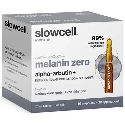 SLOWCELL MELANIN CERO 1 caja x 10 ampollas es un tratamiento cosmético facial en ampollas de alta concentración formulado para reducir y prevenir la aparición de manchas cutáneas, unificar el tono de la piel y aportar luminosidad al rostro. Cada ampolla contiene ingredientes activos despigmentantes y que actúan sobre el proceso de melanogénesis promoviendo así una apariencia más uniforme y radiante de la piel.