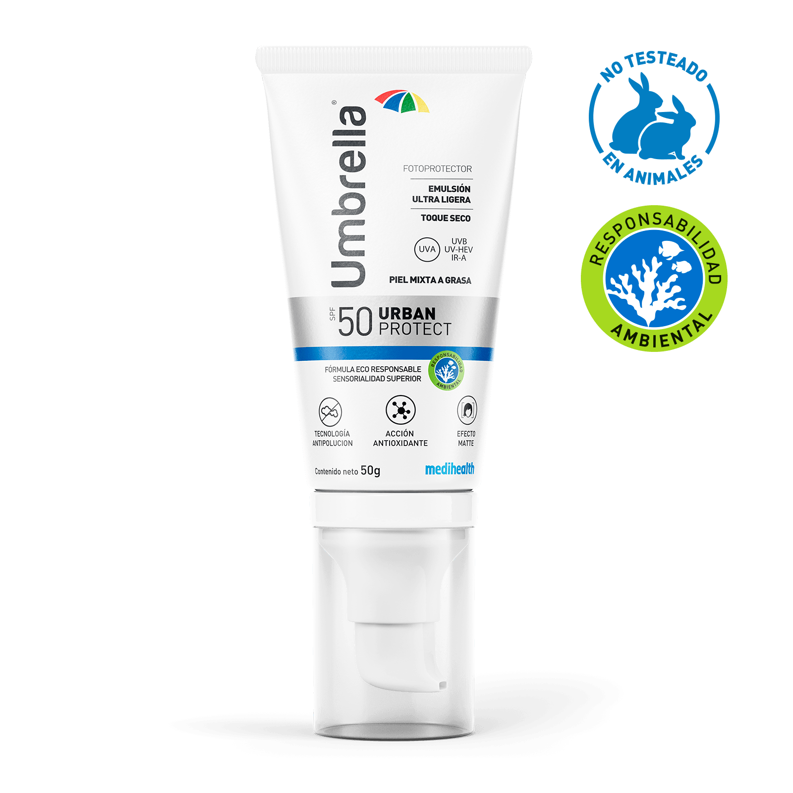 Umbrella Urban Protect SPF 50 50 g es un protector solar facial de alta protección. Su fórmula de última generación ofrece defensa de amplio espectro contra rayos UVB, UVA, luz visible de alta energía y radiación infrarroja, ayudando a prevenir el daño solar, el envejecimiento prematuro, las manchas y la inflamación asociada a la exposición solar y ambiental.