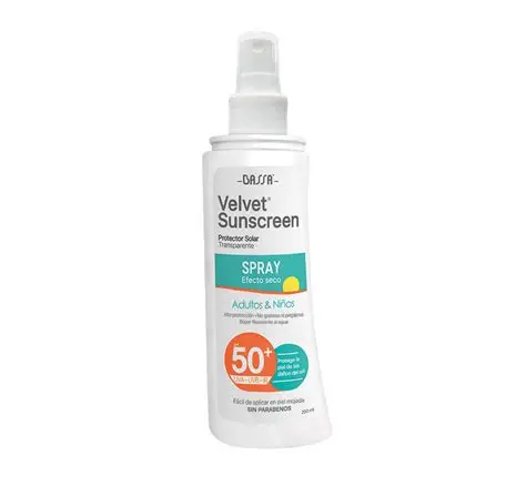 Velvet Sunscreen Spray SPF 50+ – 200 ml es un protector solar corporal de alta protección solar SPF 50+ en presentación spray. Está formulado con un sistema de filtros solares de amplio espectro que protegen frente a los rayos UVB, UVA y radiación infrarroja IR y Wet Skin Formula, que permite que el producto se aplique incluso sobre la piel mojada, lo que incrementa la resistencia al agua y al sudor y facilita la protección continua durante actividades acuáticas o deportivas.